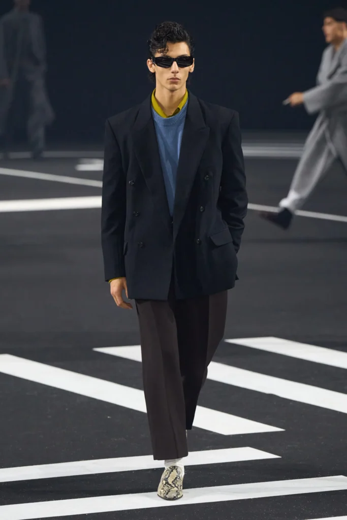 Bajo la dirección de Anthony Vaccarello, Saint Laurent dictó una lección de sensualidad masculina, con hombros exagerados y cinturas marcadas. Reviviendo la era de los 80s y el espíritu de la sofisticación parisina que siempre será impecable.
