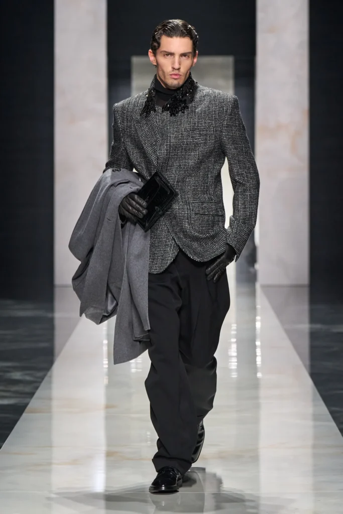 Giorgio Armani, brindó una de las entradas más emotivas, reafirmando su dominio sobre el color gris y el azul noche, devolviéndonos la chaqueta desestructurada que definió al hombre moderno (Imagen 3).