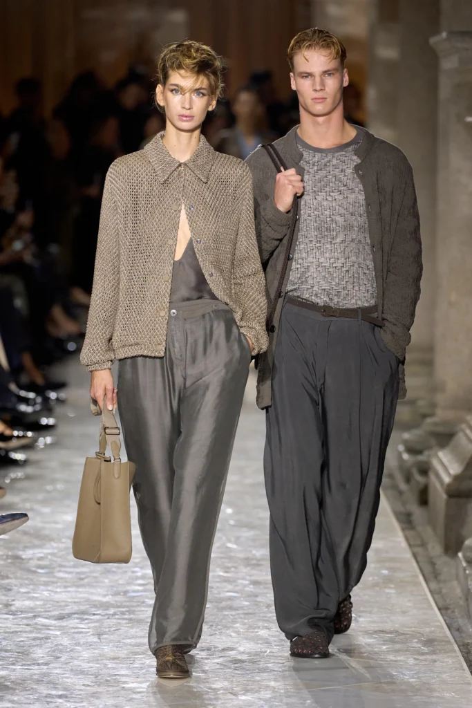Las piezas en cuero trenzado evolucionan hacia nuevas texturas, los vestidos de punto adquieren volúmenes inesperados y la gama cromática siempre contenida y siempre precisa, resalta una sofisticación que no necesita logotipos.