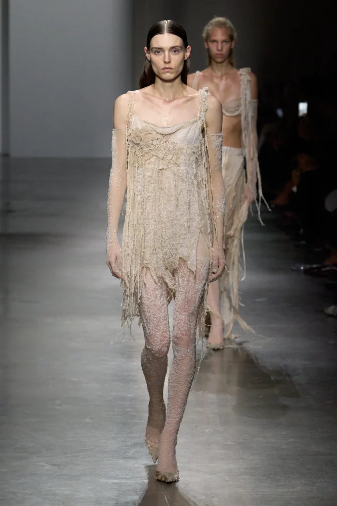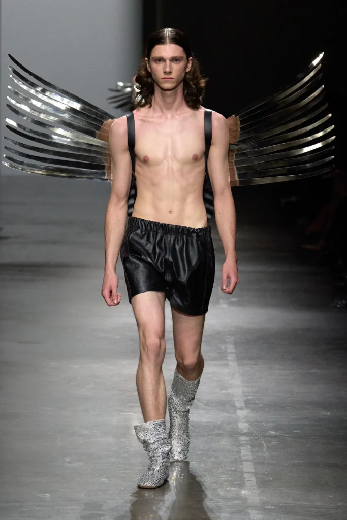 Giuseppe di Morabito continúa posicionándose como uno de los nombres jóvenes más orientados al glamour pop contemporáneo. Su runway apuesta por pedrería, corsetería, microproporciones y un sentido teatral que recuerda al maximalismo digital que domina el imaginario actual. La colección se mueve entre lo sexy y lo ornamental, con una atención especial a la construcción del cuerpo y a la exaltación del detalle brillante. Es moda hecha para ser fotografiada, celebrada y vivida en el escenario social.