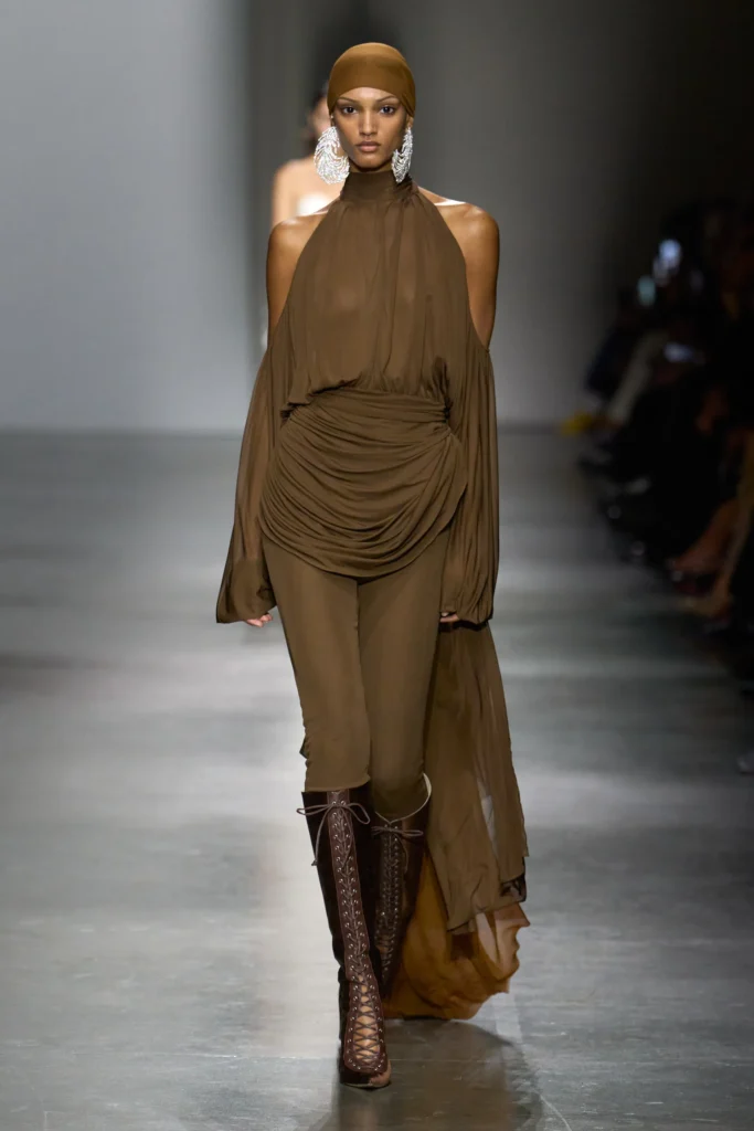 Alberta Ferretti presentó una colección profundamente evocadora, fiel a su romanticismo característico pero con una madurez nueva que se siente más introspectiva que de simple decoración. Las siluetas fluyen casi como si respiraran, con vestidos vaporosos, capas traslucidas y caftanes que se mueven con un ritmo propio que revelan diseñados que entienden la sensualidad desde la calma, no desde la exageración. La paleta se mantiene en tonos arena, crema, rosa suave y un toque de noche en los contrastes más oscuros.
